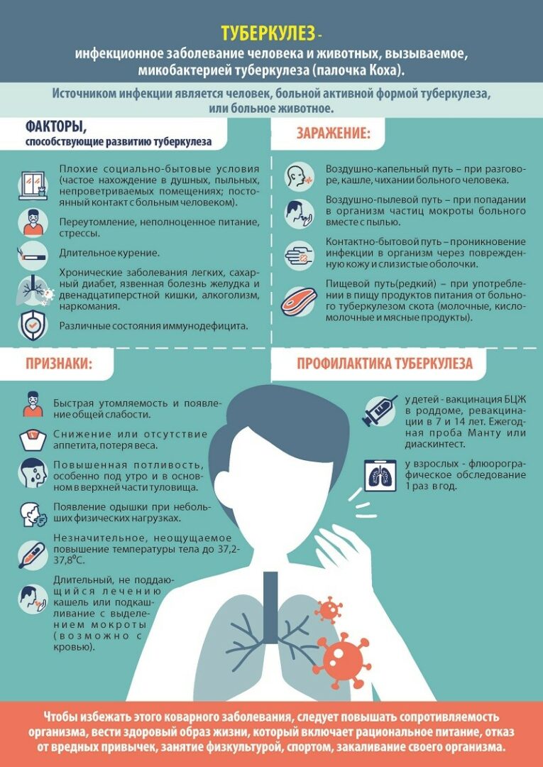 Вакцинация БЦЖ (при рождении, в 7 лет). Туберкулинодиагностика у детей — ежегодно, с 15 лет флюорография легких 1 раз в два года. Всем, кто был в контакте с профилактической целью назначаются противотуберкулезные препараты. Правильное питание (мясо, свежие фрукты, овощи, молоко и кисломолочные продукты). Оптимальное сочетание режима труда и отдыха, достаточный сон, прогулки на свежем воздухе. Отказ от вредных привычек.Берегите себя и своих близких!