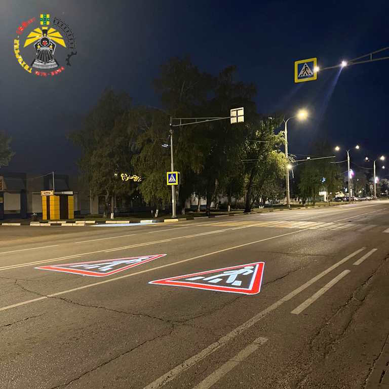 Проекционная разметка – это новая альтернатива традиционного пешеходного перехода. При неблагоприятных погодных условиях – дожде или снеге, ее видно с расстояния более 150 м. Дорожная разметка установлена вблизи стадиона «Труд». Работу выполнила компания «Лампа-Групп».